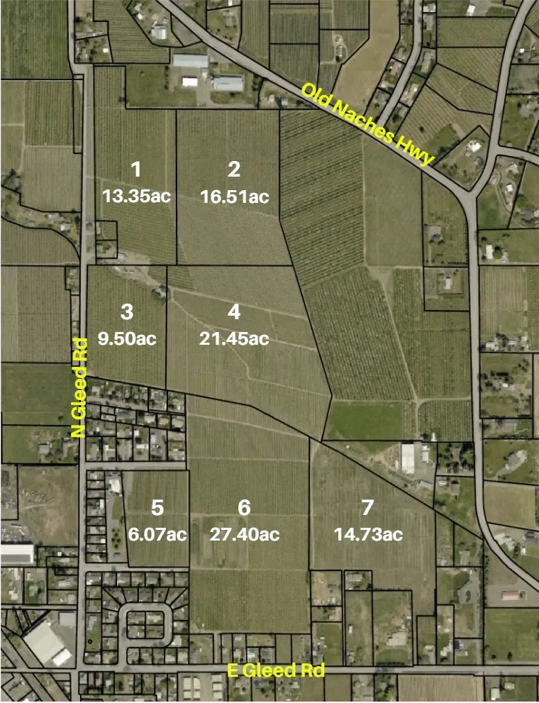 +"PublicRemarks": "• 109+ acres of development land• 1 mile to Hwy 12 | 8 miles to Yakima• Strong regional access & growth corridor• Existing agricultural income (fruit trees)• Zoning changes being explored• Power available | Septic required\tParcel\t Acreage\tNotes1\t181429-33009\t13.35\tGarage2\t181429-33006\t16.51\t3\t181432-22002\t9.5\t Manufactured Home4\t181432-22001\t21.45\t5\t181432-23002\t6.07\t6\t181432-23001\t27.4\t House, 1950, 1,088 sf7\t181432-24020\t14.73\t\t\t\t\tTotal Acreage\t109.01\t"